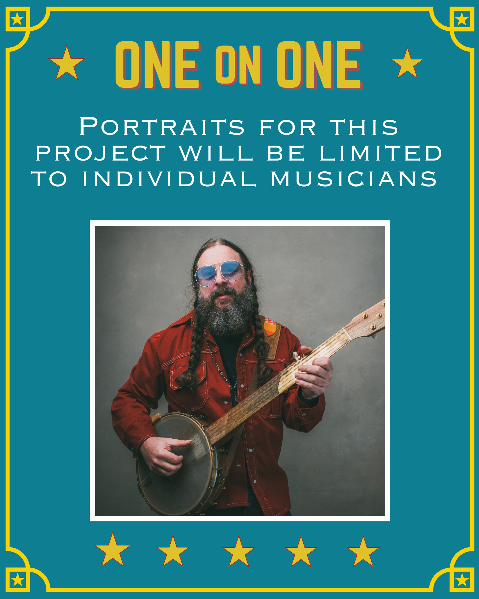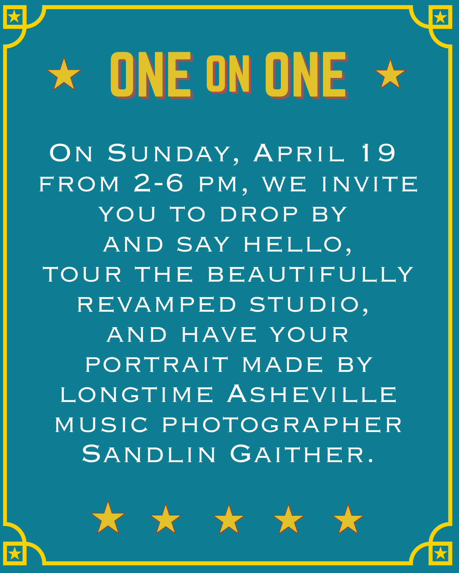 Free musician portraits (yes!): Get your photo taken by acclaimed local photographer and friend of the studio Sandlin Gaither while you’re here! First come, first served. All the details are below.